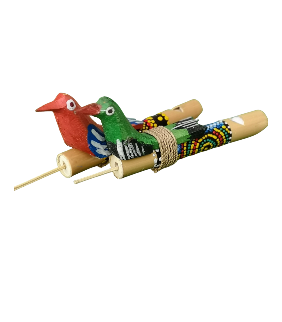 Silbato bambú pájaro hecho en madera y pintado a mano, mide unos 15 cm aproximadamente. Los colores pueden variar. Se venden en pack de 10 unidades.